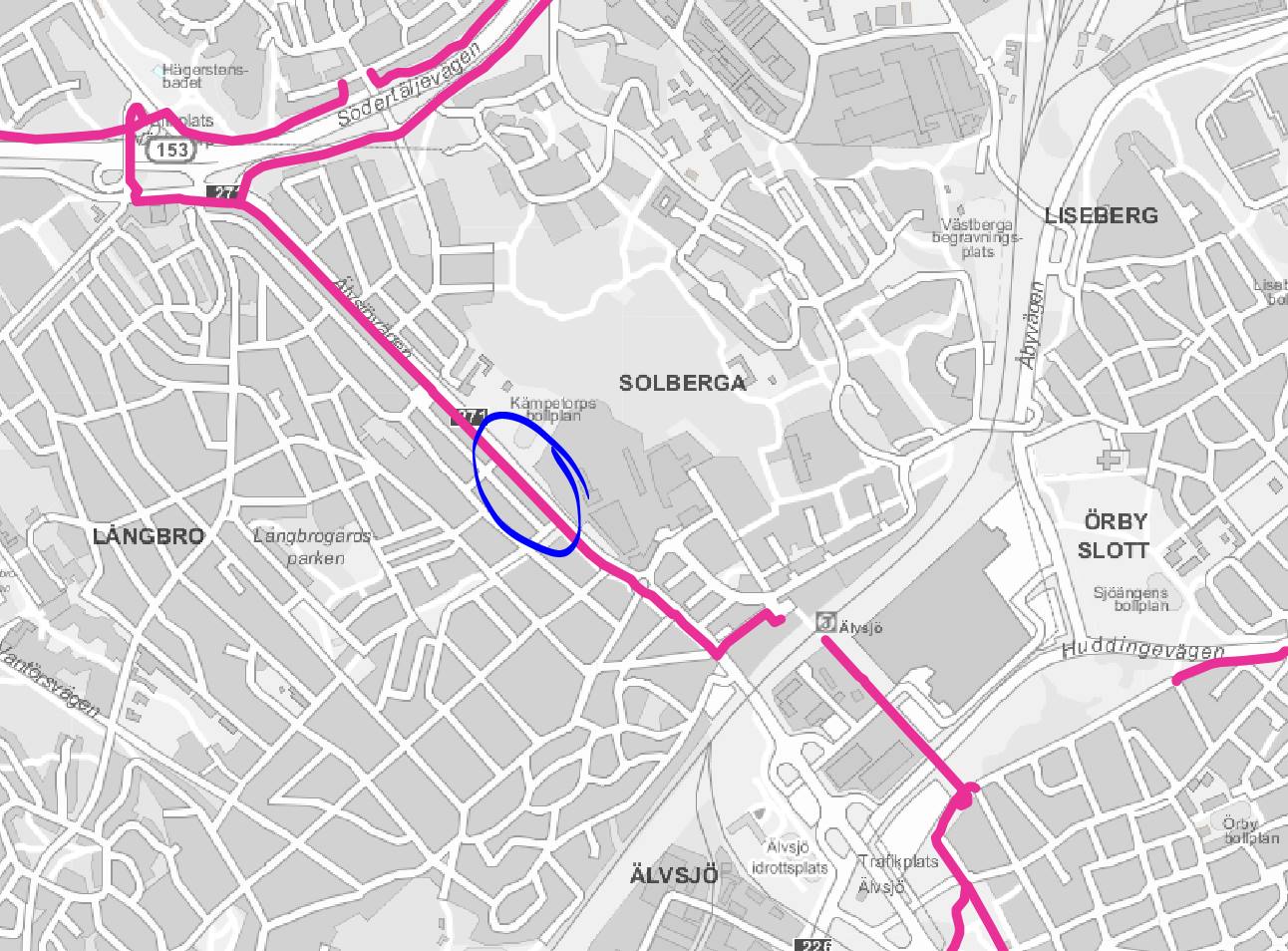 | Karta från Stockholm Stads hemsida med markerade prio pendelstråk som skall sopsaltas. Det inringade området är där fotografierna är tagna. |
